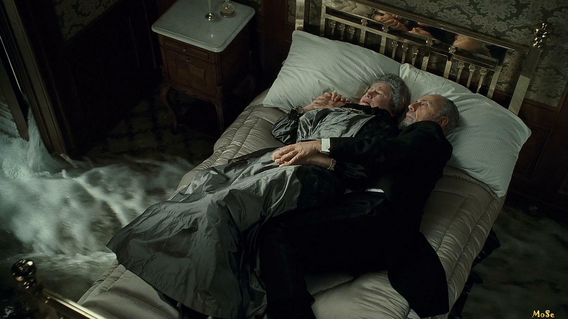 1. Пожилая пара, которую видели в фильме обнимающейся на кровати, пока вода затапливала их комнату, была владельцами универмага Macy's в Нью-Йорке Розали Идой Штраус и Исидором Штраусом, оба погибли на Титанике. Иде предложили место в спасательной шлюпке, но она отказалась, чтобы она могла остаться с мужем, сказав: «Как мы жили вместе, так и умрем вместе». Была снята сцена, изображающая этот момент, но она была вырезана из окончательной версии. Именно миссис Штраус изначально сказала: «Куда ты идешь, я иду», что вдохновило Роуз на ту же фразу в фильме.